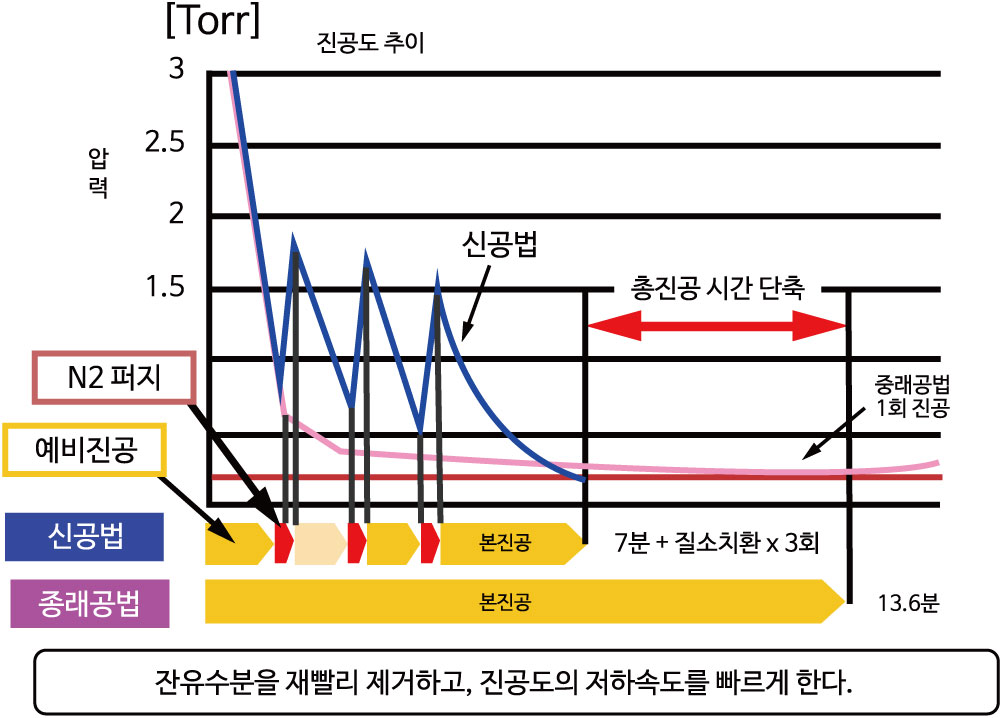 진공질소 치환시스템은 일본 TMT사와 당사 협업적으로 개발한 것으로 종래의 진공 도달시간을 획기적으로 줄일 수 있어 고객사의 운영비 절감 및 생산성, 품질 향상을 도모할 수 있습니다. 건조한 N2가스의 퍼지와 치환을 반복함으로써 시스템 표면에 부착한 수분의 기화를 촉진시켜, 소정의 진공도에 도달하는 시간을 대폭 단축시킬 수 있습니다.